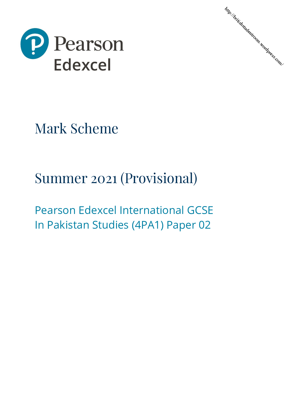 Pakistan Studies > GCSE MARK SCHEME > Mark Scheme Summer 2021 (Provisional) Pearson Edexcel International GCSE In Pakistan Studies (4PA1) Paper 02. Predictor paper (All)