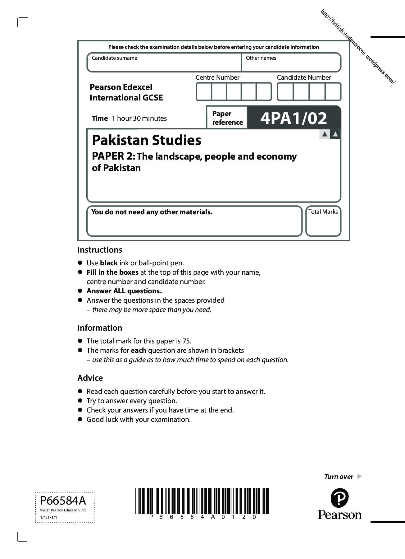 Pakistan Studies > GCSE QUESTION PAPER > Pearson Edexcel International GCSE. Pakistan Studies PAPER 2: The landscape, people and economy of Pakistan. PREDICTOR PAPER. (All)
