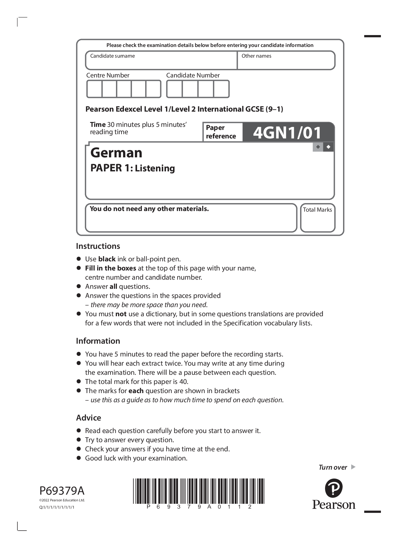 German > Edexcel > 2022 pearson june booklet + mark scheme Edexcel Level 1/Level 2 International GCSE (9–1) 4GN1/01 German PAPER 1: Listening (All)