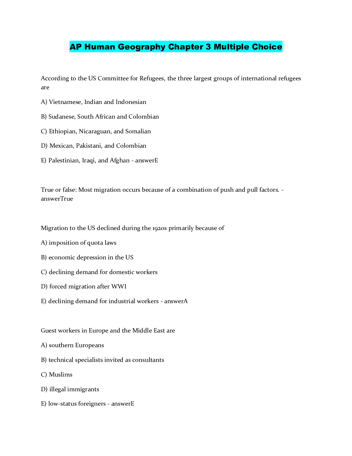 Geography > QUESTIONS & ANSWERS > AP Human Geography Chapter 3 Multiple Choice (All)