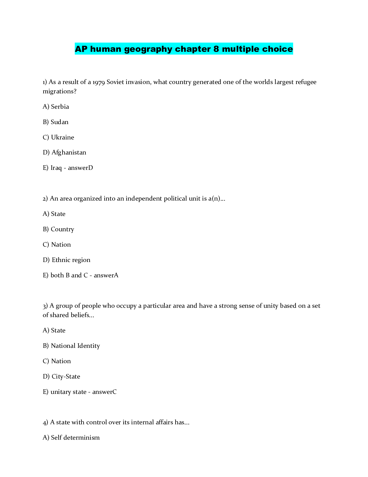 Geography > QUESTIONS & ANSWERS > AP Human Geography Multiple Choice Questions Final Exam 2022 with complete solution (All)