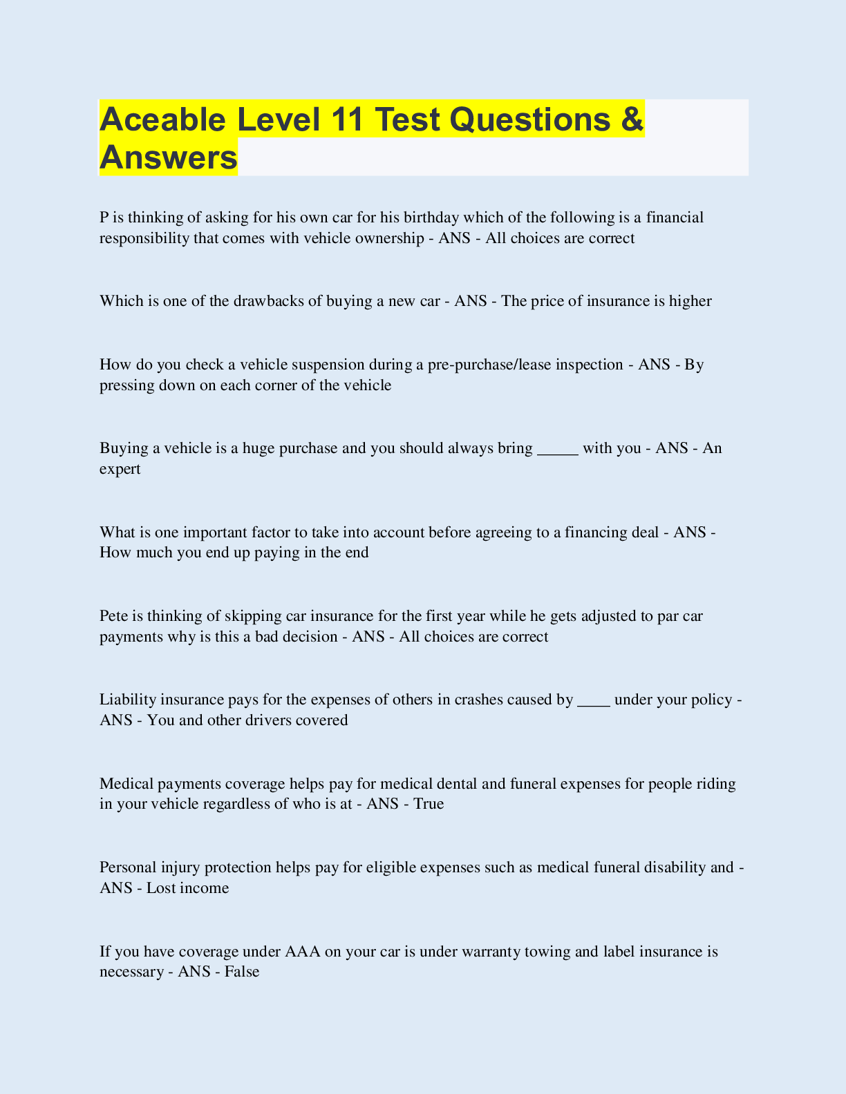 Driving Course > EXAM > Aceable Level 11 Test Questions & Answers | 40 Questions with 100% Correct Answers | Updated & Verified (All)