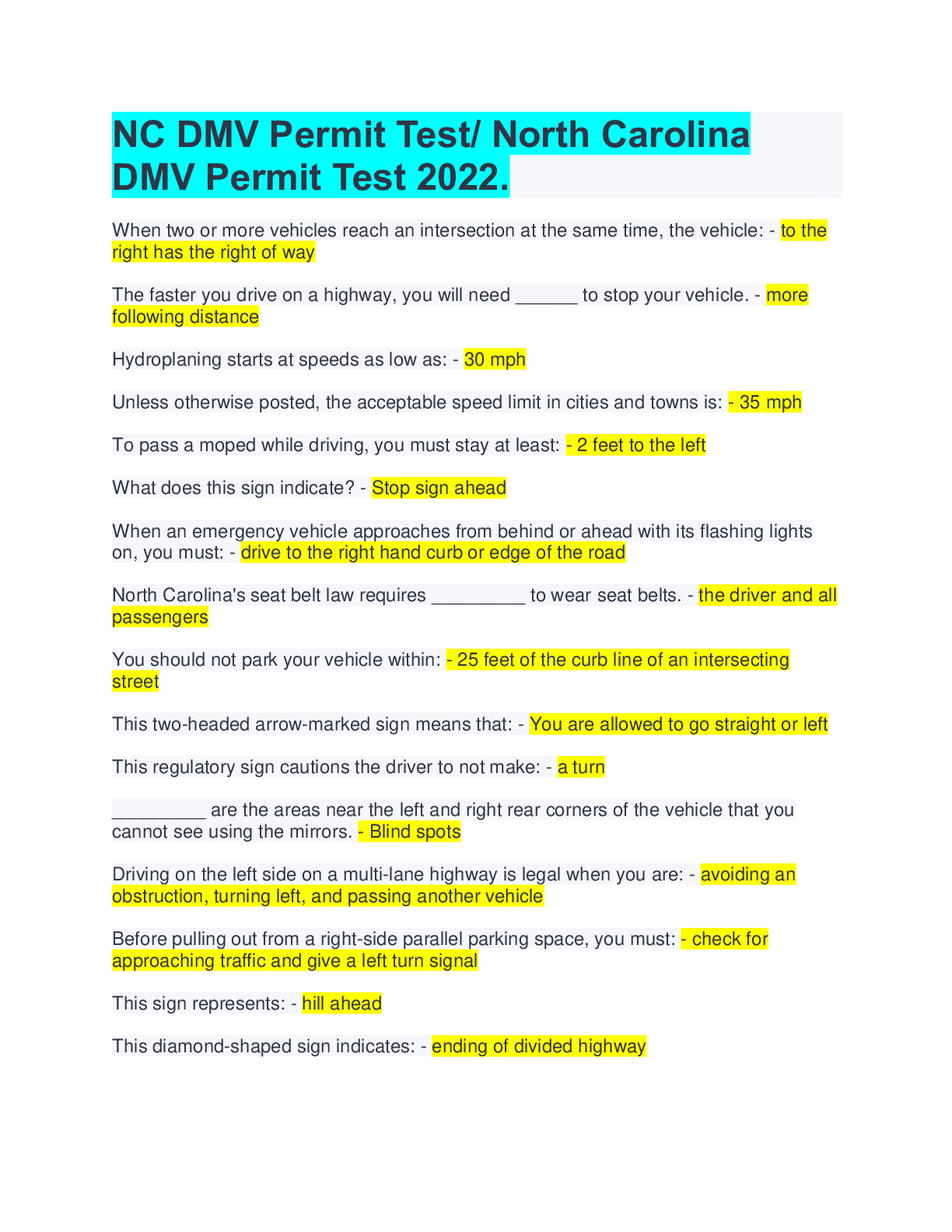 Driving Course > EXAM > (Study this one!) NC DMV Permit Test/ North Carolina DMV Permit Test 2022. (All)