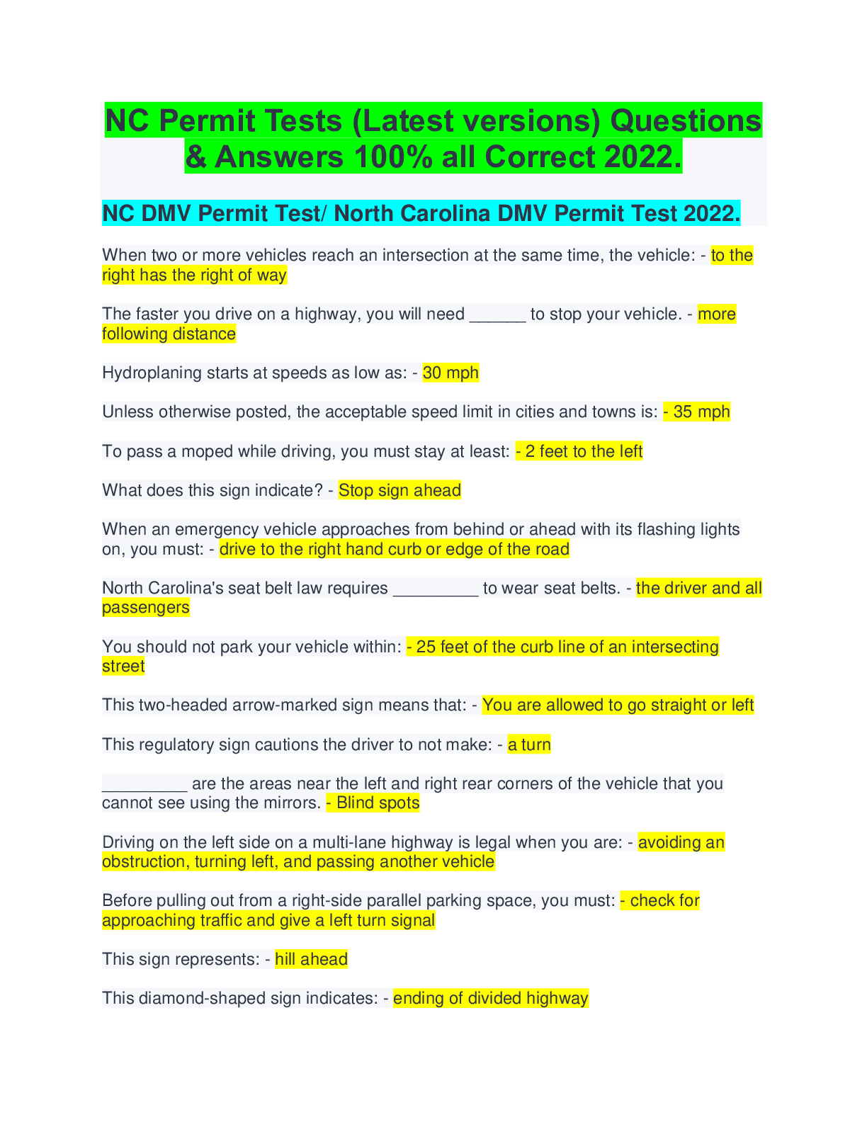 Driving Course > EXAM > NC Permit Tests (5 Latest versions) Questions & Answers 100% all Correct 2022. (All)