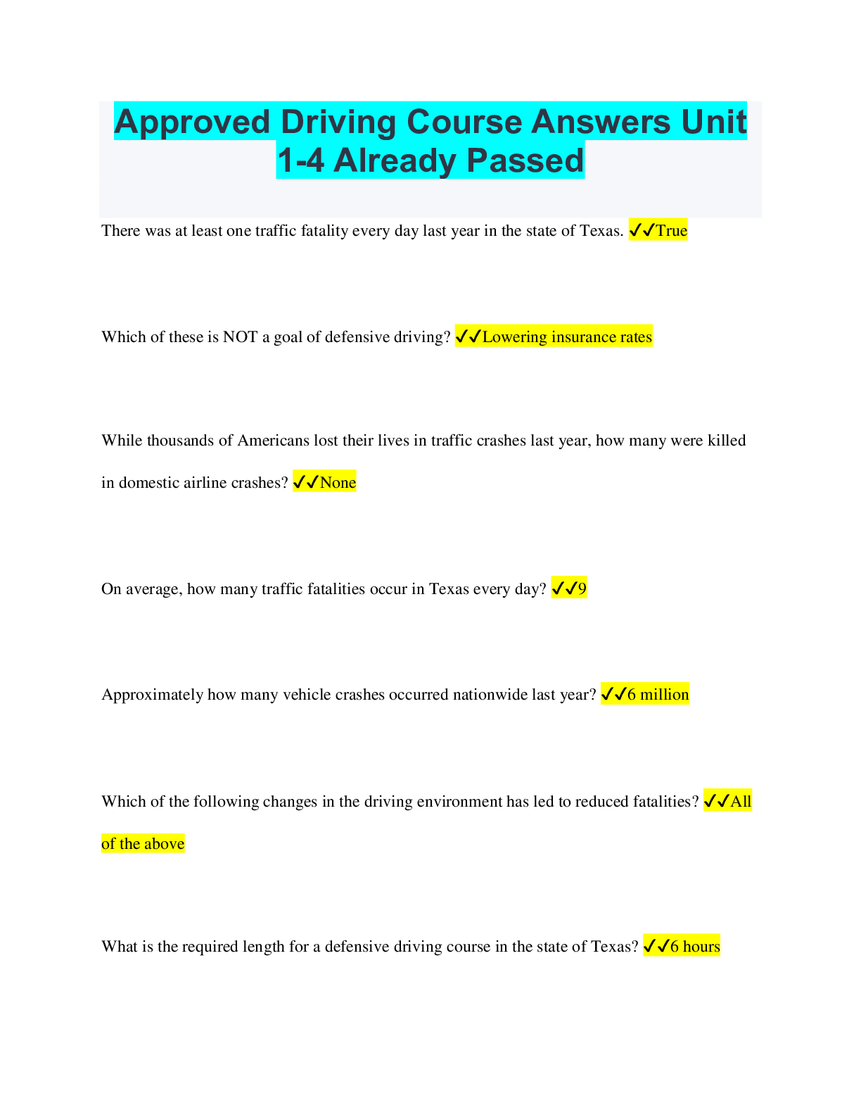 Driving Course > QUESTIONS & ANSWERS > Approved Driving Course Answers Unit 1-4 Already Passed (All)
