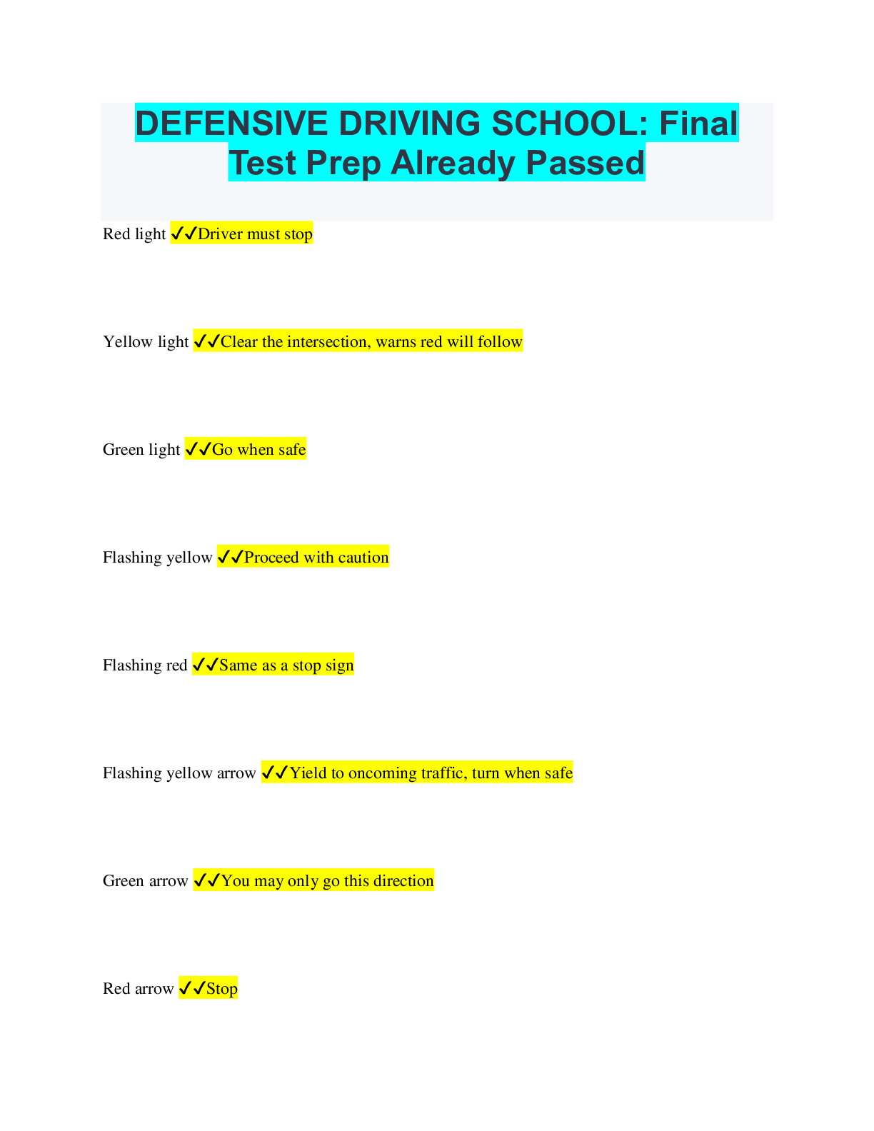 Driving Course > QUESTIONS & ANSWERS > DEFENSIVE DRIVING SCHOOL: Final Test Prep Already Passed (All)