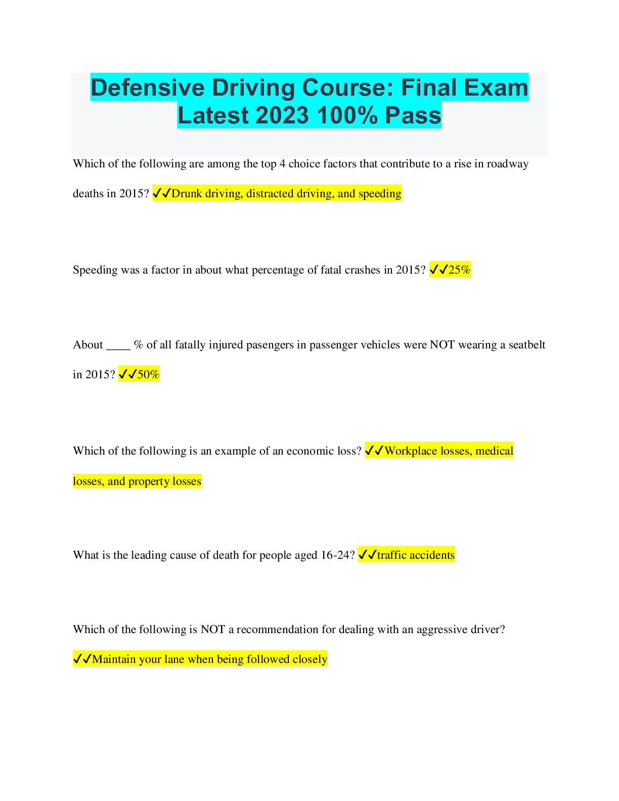 Driving Course > QUESTIONS & ANSWERS > Defensive Driving Course: Final Exam Latest 2023 100% Pass (All)