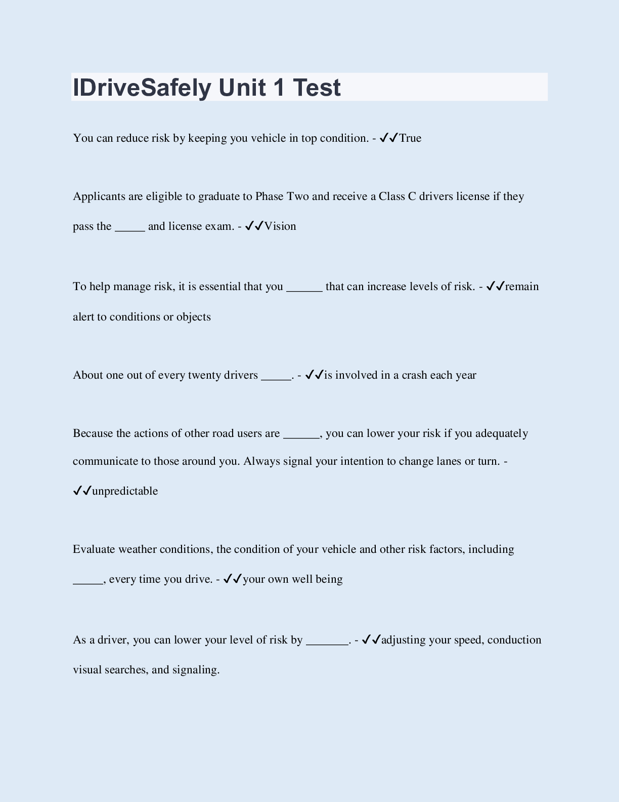 Driving Course > QUESTIONS & ANSWERS > I Drive Safely Test Questions & Answers (All)