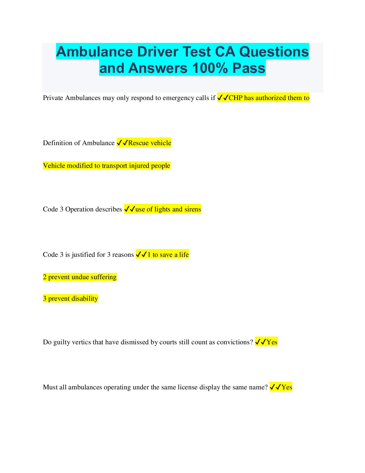 Driving Course > QUESTIONS & ANSWERS > Ambulance Driver Test CA Questions and Answers 100% Pass (All)