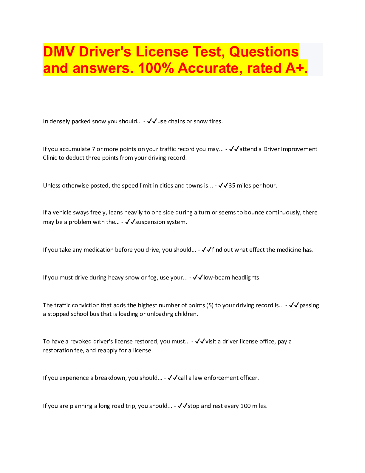 Driving Course > QUESTIONS & ANSWERS > DMV Driver's License Test, Questions and answers. 100% Accurate, rated A+. (All)