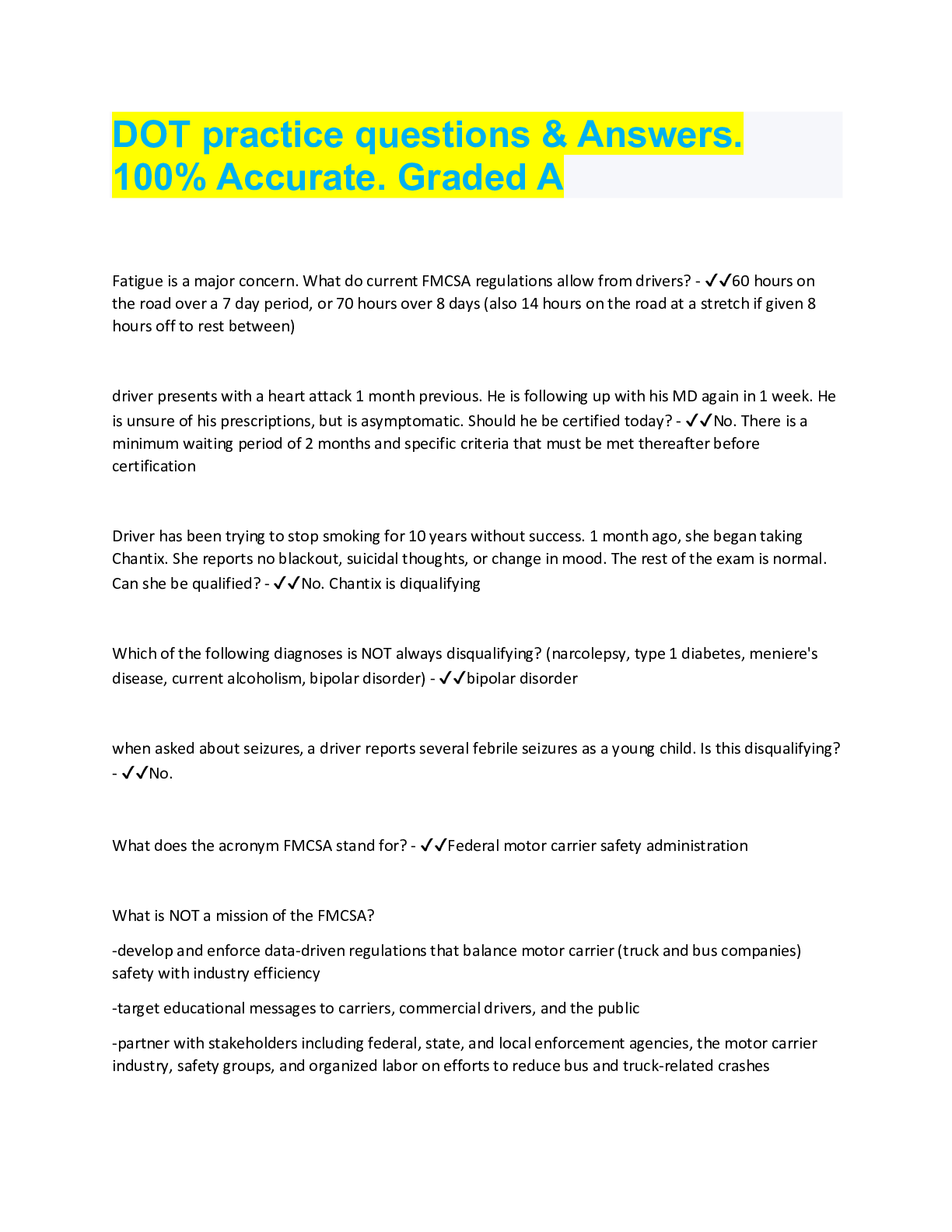 Driving Course > QUESTIONS & ANSWERS > DOT practice questions & Answers. 100% Accurate. Graded A (All)