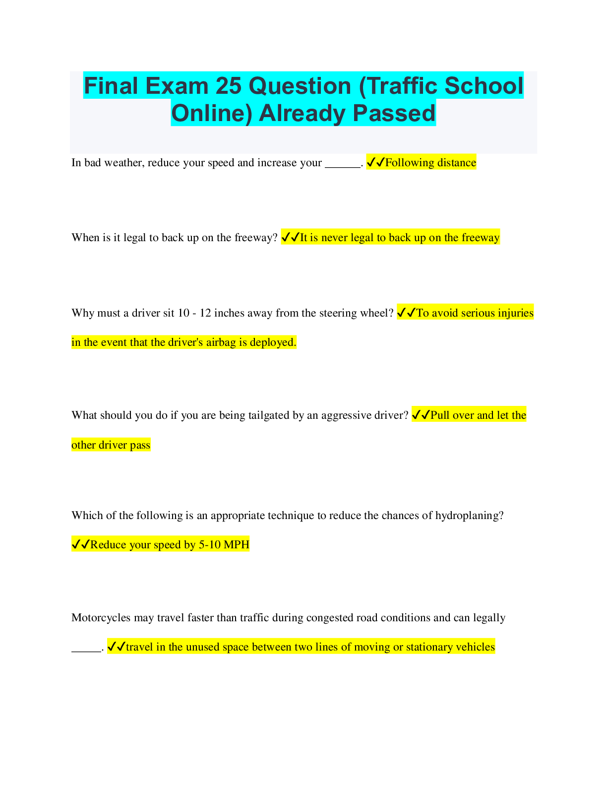 Driving Course > QUESTIONS & ANSWERS > Final Exam 25 Question (Traffic School Online) Already Passed (All)
