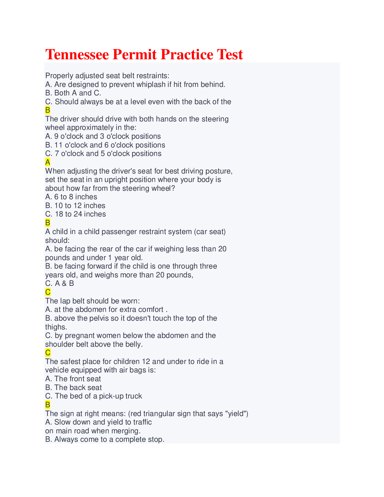 Driving Course > EXAM > Tennessee Permit Practice Test Exams with Multiple Choices (All)