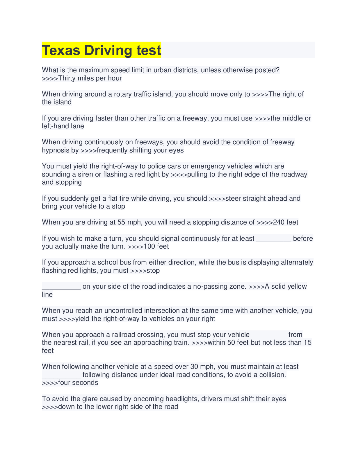 Driving Course > QUESTIONS & ANSWERS > Texas Driving test, Questions and answers. 100% proven pass rate (All)
