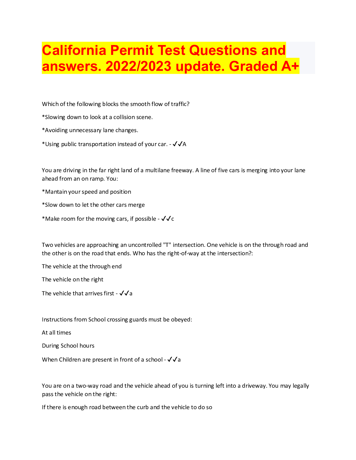 Driving Course > QUESTIONS & ANSWERS > California Permit Practice Test Questions 2022 with accurate answers. Graded A+ (All)
