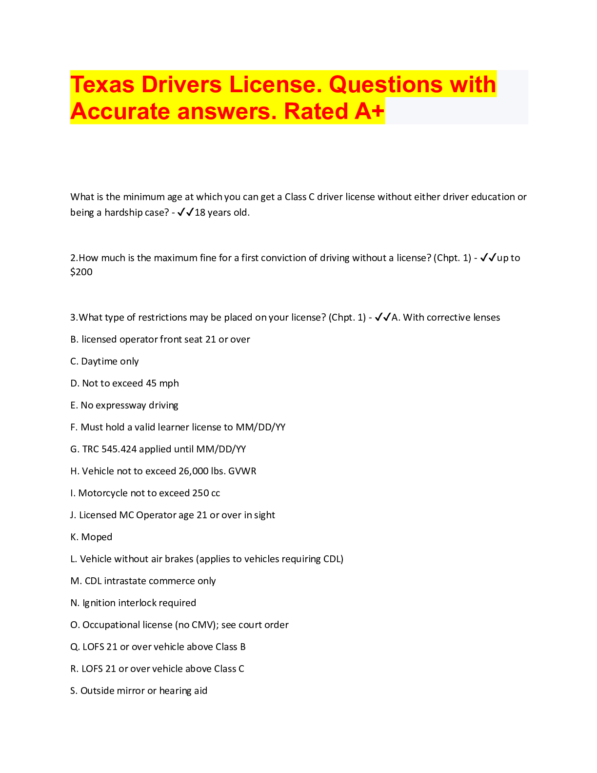 Driving Course > QUESTIONS & ANSWERS > Texas Drivers License. Questions with Accurate answers. Rated A+ (All)