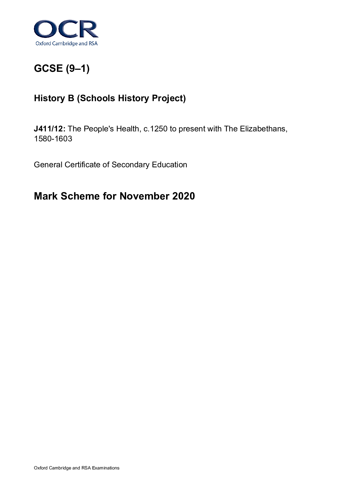 History > GCSE MARK SCHEME > GCSE (9–1) History B (Schools History Project) J411/12: The People's Health, c.1250 to present with The Elizabethans, 1580-1603 General Certificate of Secondary Education Mark Scheme for November 2020 (All)