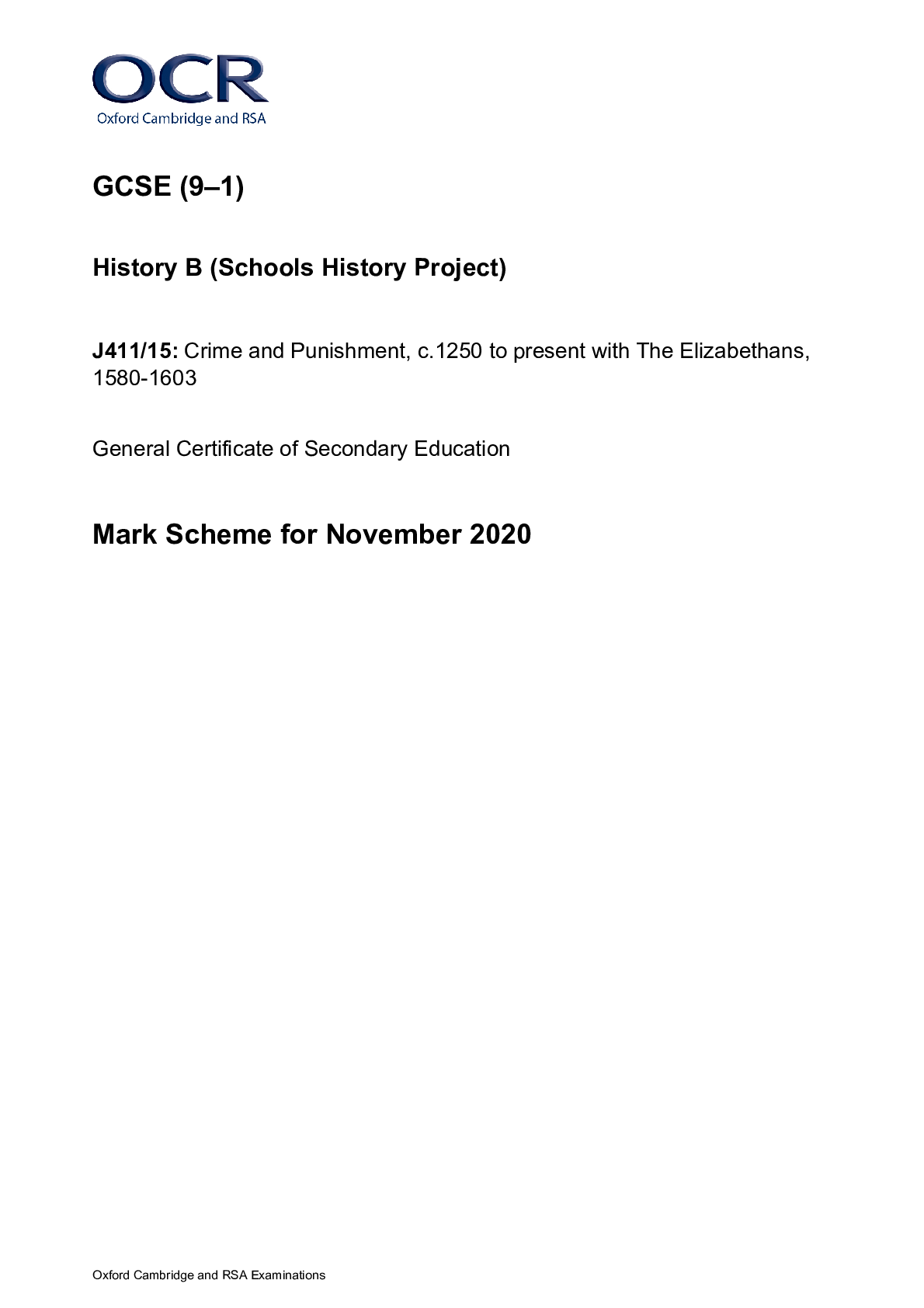 History > GCSE MARK SCHEME > GCSE (9–1) History B (Schools History Project) J411/15: Crime and Punishment, c.1250 to present with The Elizabethans, 1580-1603 General Certificate of Secondary Education Mark Scheme for November 2020 (All)