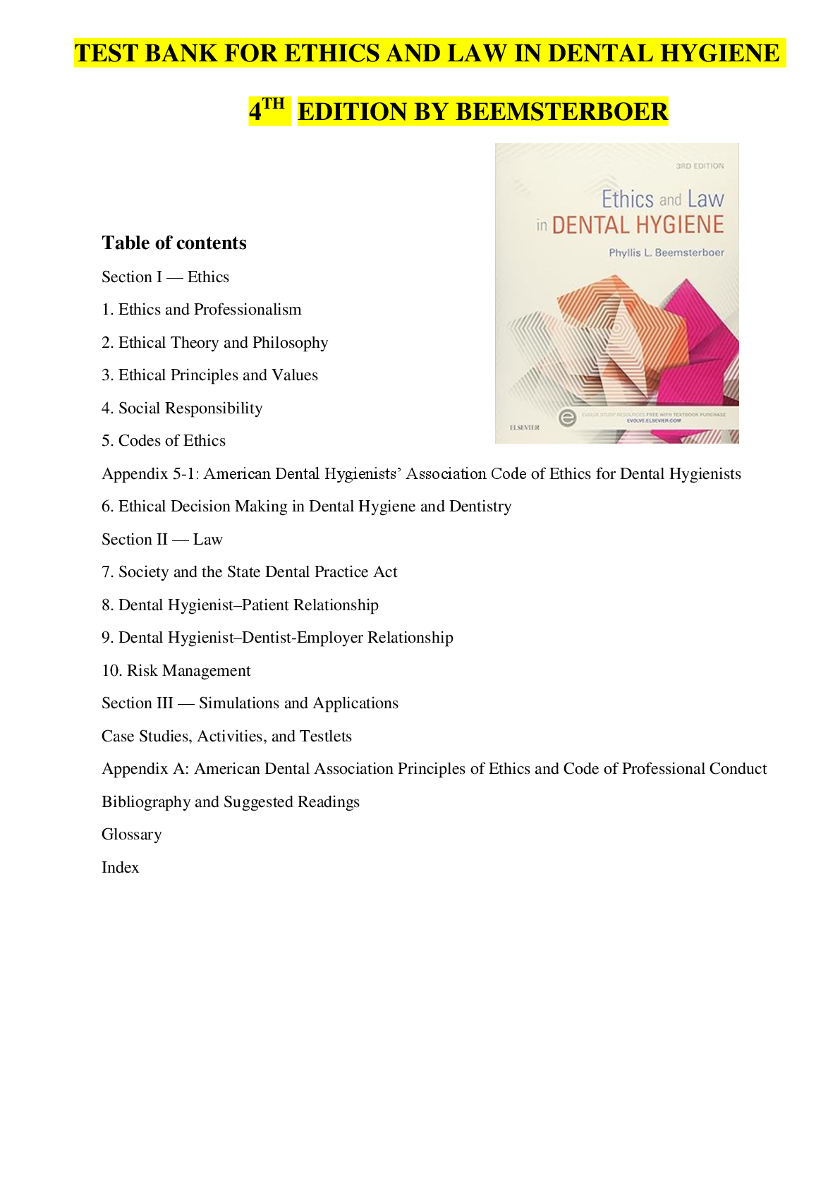 Business Ethics > TEST BANKS > TEST BANK For Ethics And Law In Dental Hygiene 3rd Edition By Beemsterboer (All)