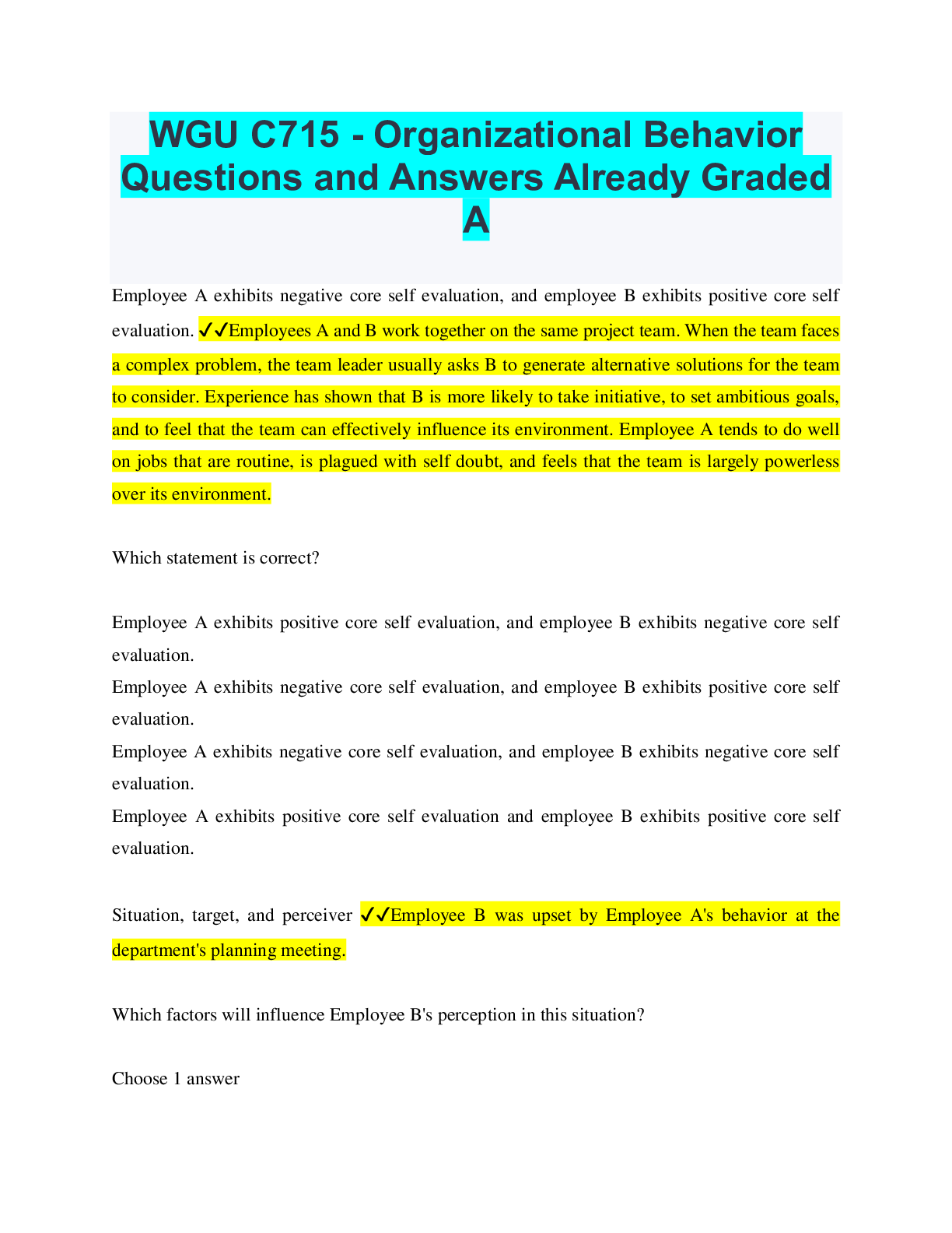 Business Ethics > QUESTIONS & ANSWERS > WGU C715 - Organizational Behavior Questions and Answers Already Graded A (All)