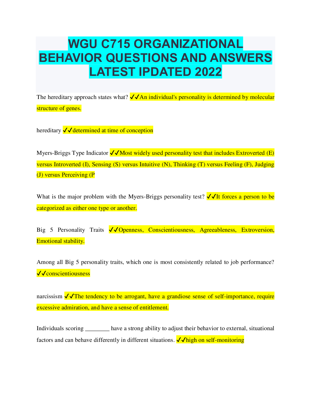 Business Ethics > QUESTIONS & ANSWERS > WGU C715 ORGANIZATIONAL BEHAVIOR QUESTIONS AND ANSWERS LATEST UPDATED 2022 (All)