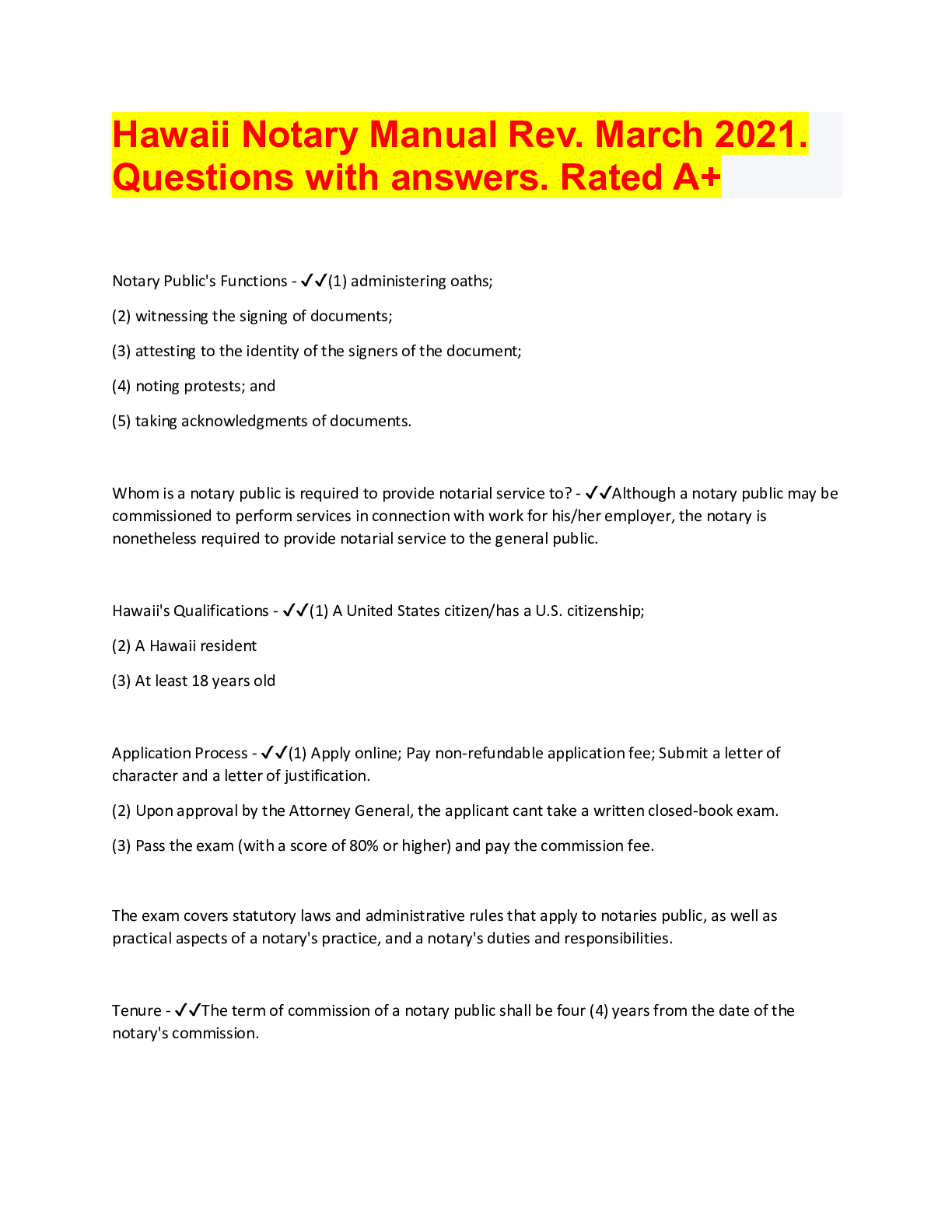 Law > QUESTIONS & ANSWERS > Hawaii Notary Manual Rev. March 2021. Questions with answers. Rated A+ (All)
