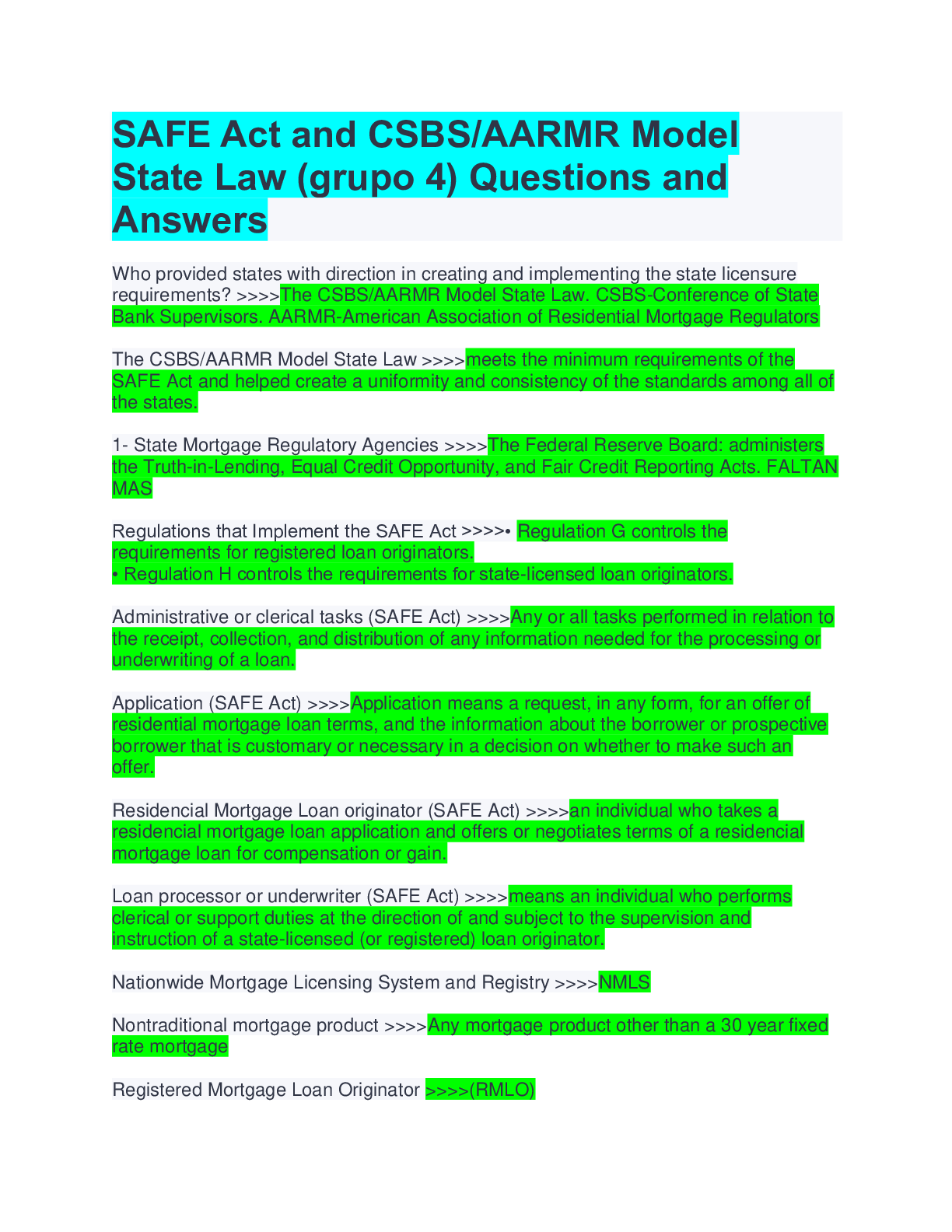 Law > QUESTIONS & ANSWERS > SAFE Act and CSBS/AARMR Model State Law (grupo 4) Questions and Answers (All)