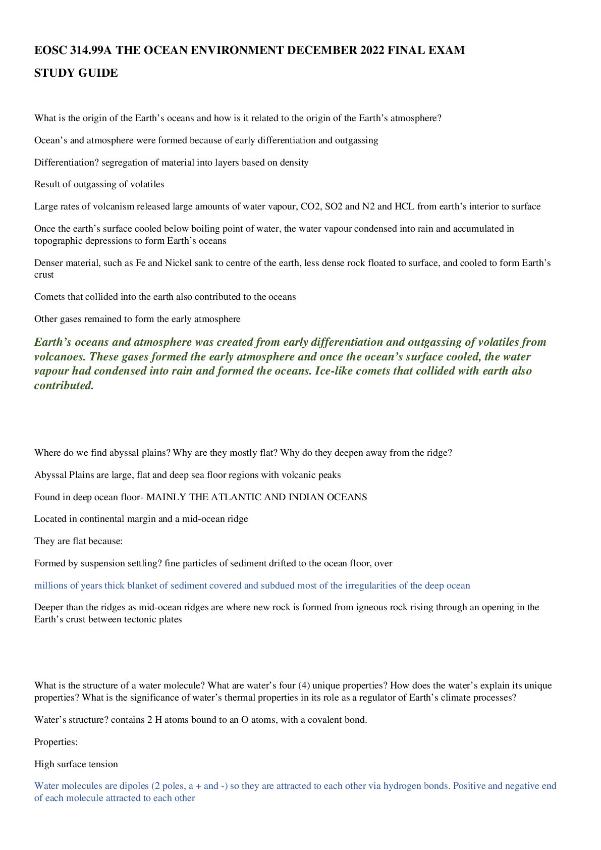 Ecology > QUESTIONS and ANSWERS > EOSC 314.99A THE OCEAN ENVIRONMENT DECEMBER 2022 FINAL EXAM STUDY GUIDE (All)