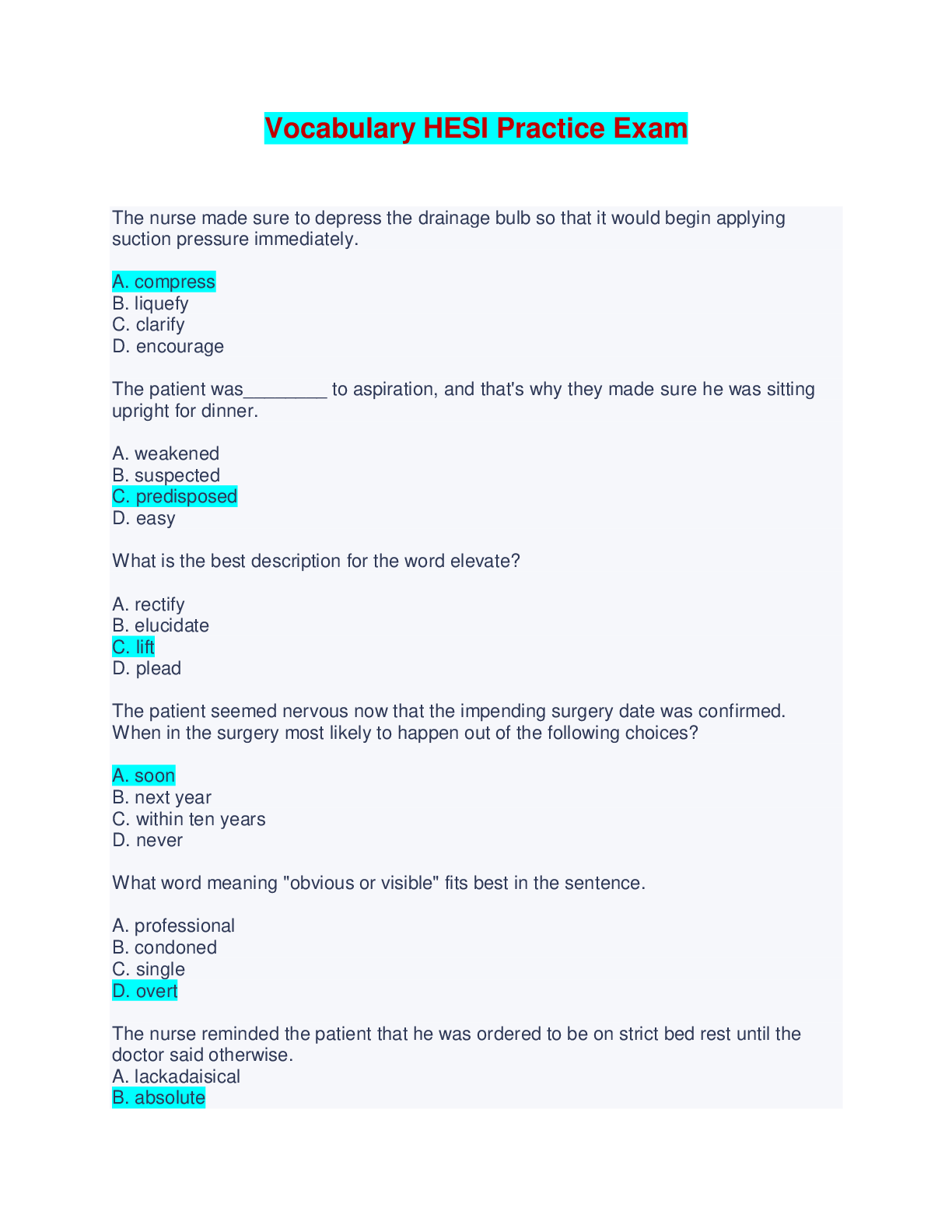 Linguistics > EXAM > Vocabulary HESI Practice Exam - Questions and Answers (All)