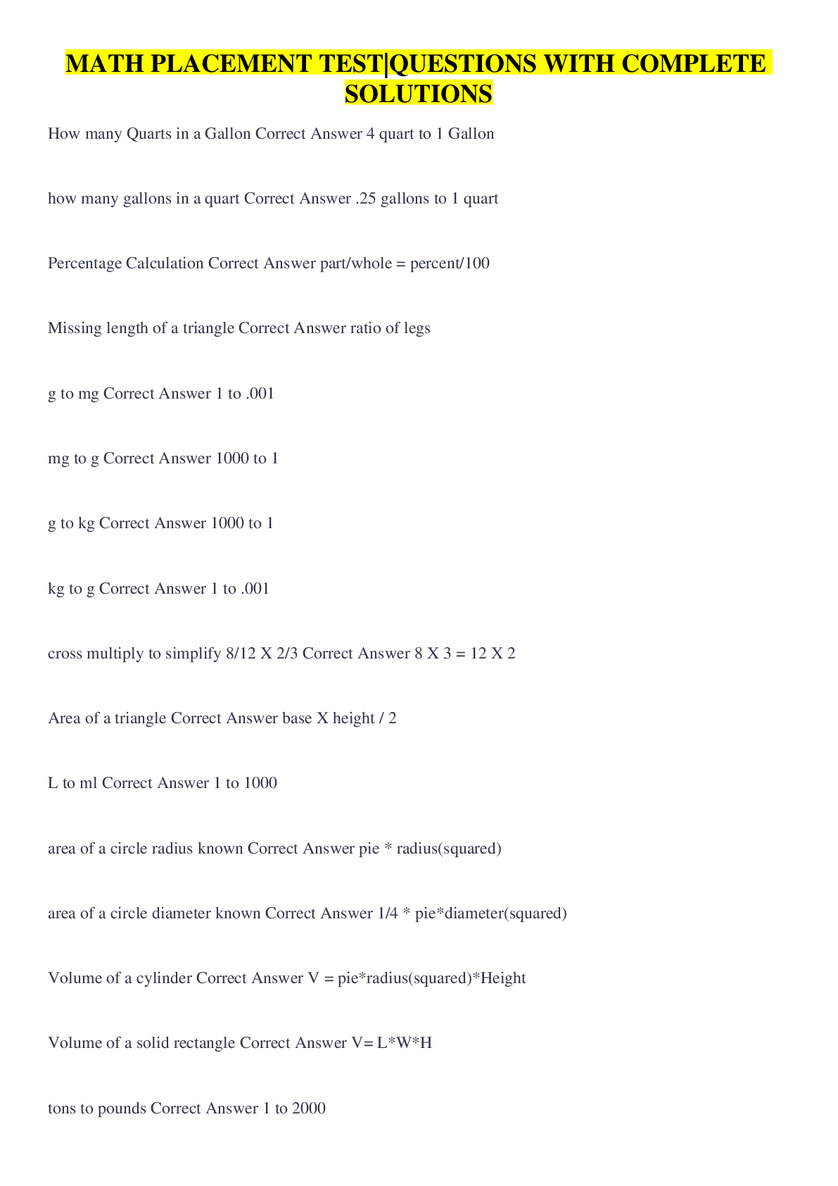 Mathematics > QUESTION PAPER & MARK SCHEME > MATH PLACEMENT TEST|QUESTIONS WITH COMPLETE SOLUTIONS (All)