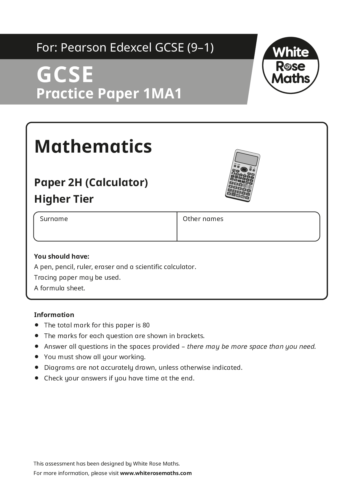 Mathematics > EXAM > Pearson Edexcel GCSE (9-1) GCSE Practice Paper 1MA1MathematicsPaper 2H (Calculator)Higher Tier (All)
