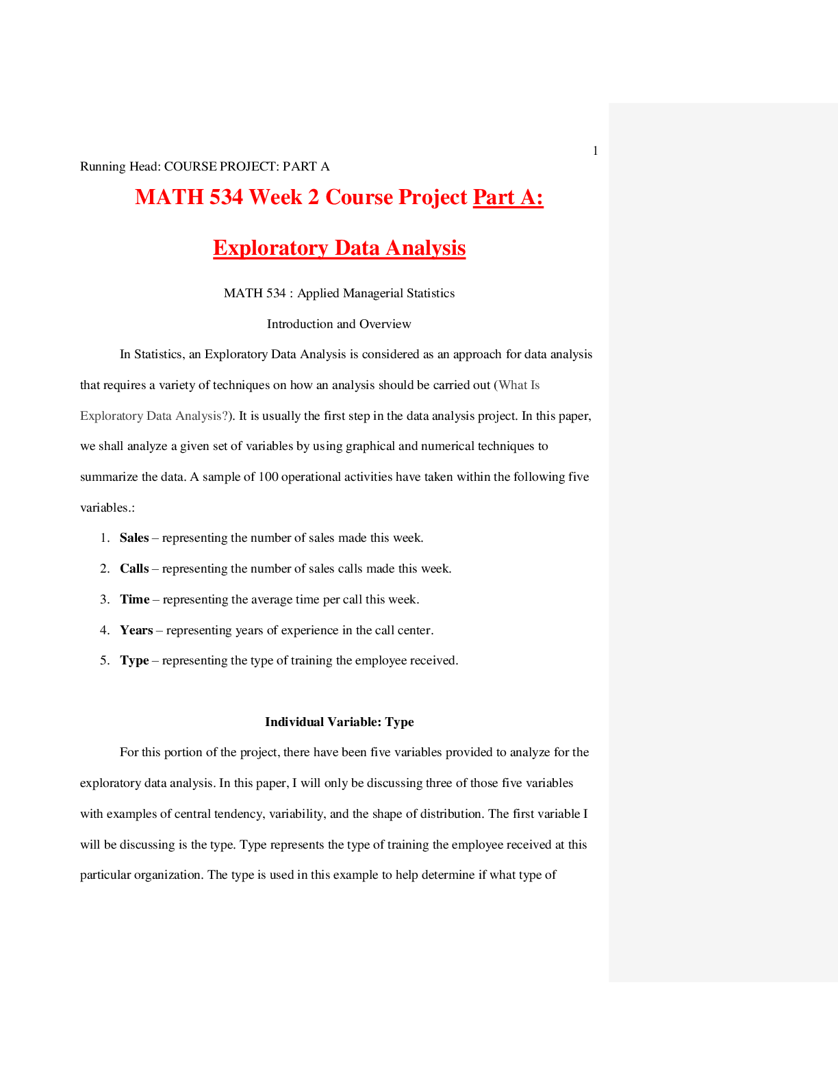 Mathematics > STUDY GUIDE > MATH 534 Week 2 Course Project Part A; Exploratory Data Analysis (All)