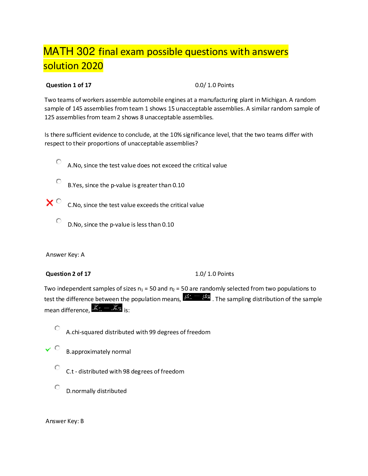 Mathematics > QUESTIONS & ANSWERS > MATH534 Final Exam Solution’s Study Guide solution with answers 2020 docs devry university (All)