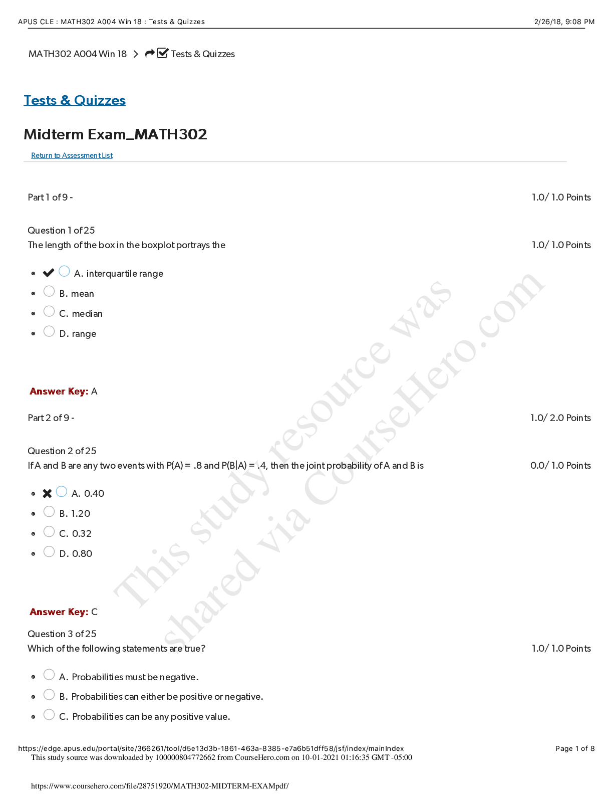 Mathematics > EXAM > Midterm Exam MATH302 MATH 302 Midterm Week 8 EXAM (All)