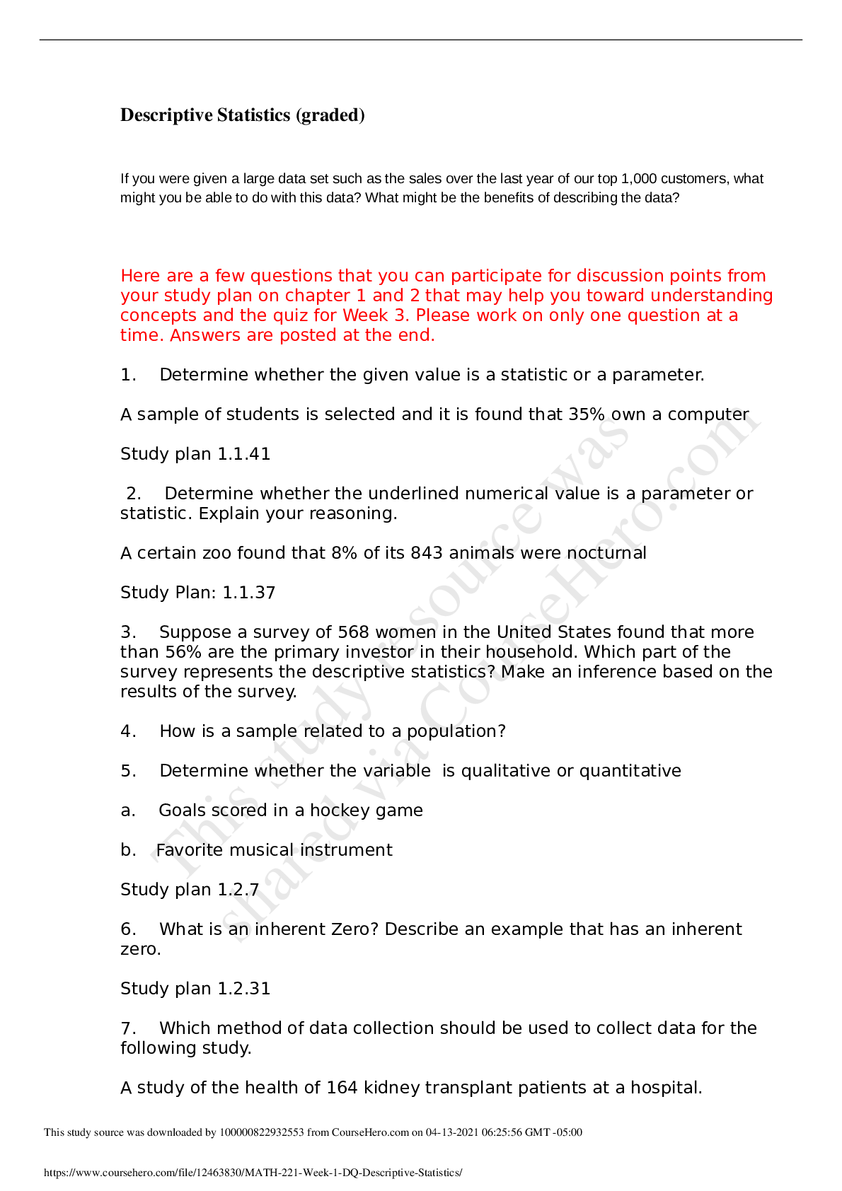Mathematics > QUESTIONS & ANSWERS > MATH 225N Week 1 Evidence, Claims, and types Questions / Answers...All correct..2021 (All)