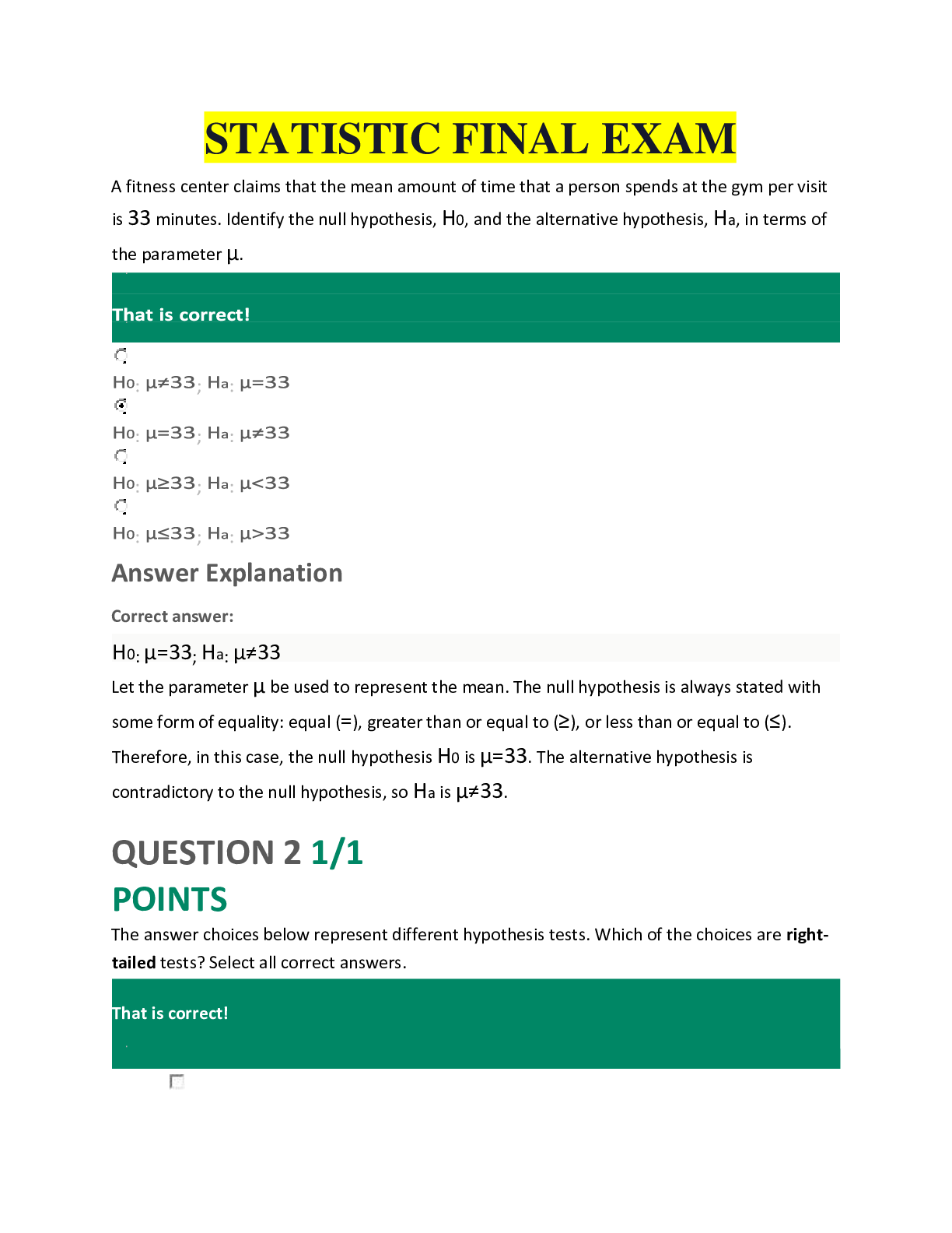 Mathematics > EXAM > STATISTIC FINAL EXAM ALREADY GRADED (All)