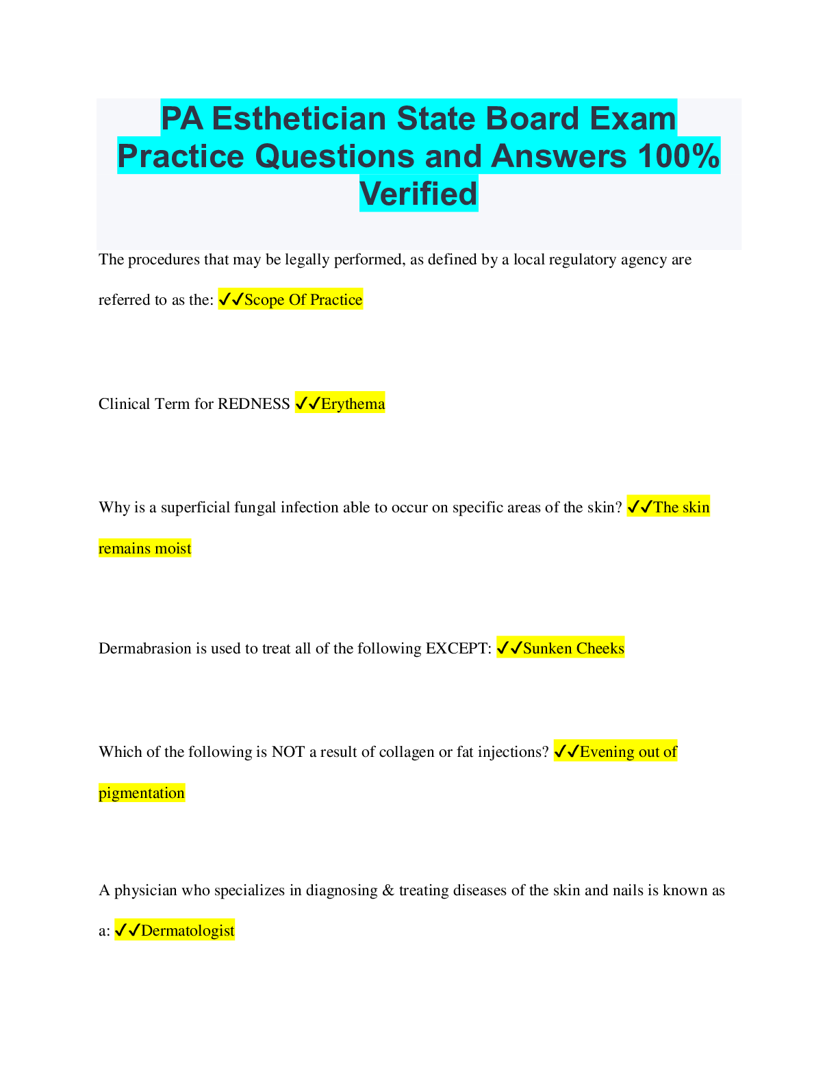 Philosophy > QUESTIONS & ANSWERS > PA Esthetician State Board Exam Practice Questions and Answers 100% Verified (All)