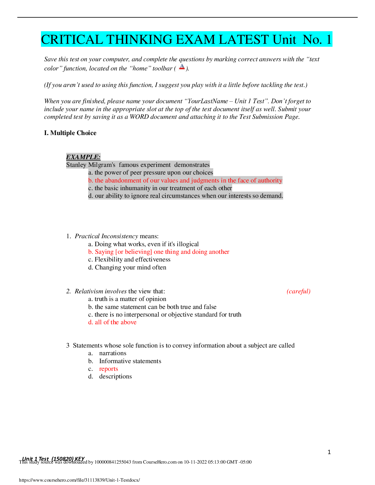 Philosophy > QUESTIONS & ANSWERS > CRITICAL THINKING EXAM LATEST Unit No. 1 (All)
