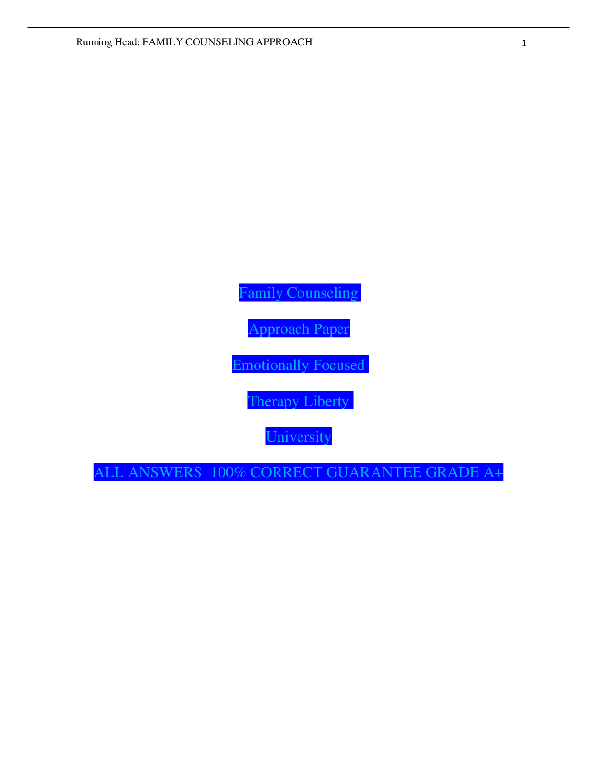 Philosophy > Solutions Guide > Family Counseling Approach Paper Emotionally Focused Therapy Liberty University ALL ANSWERS 100% CORRECT GUARANTEE GRADE A+ (All)