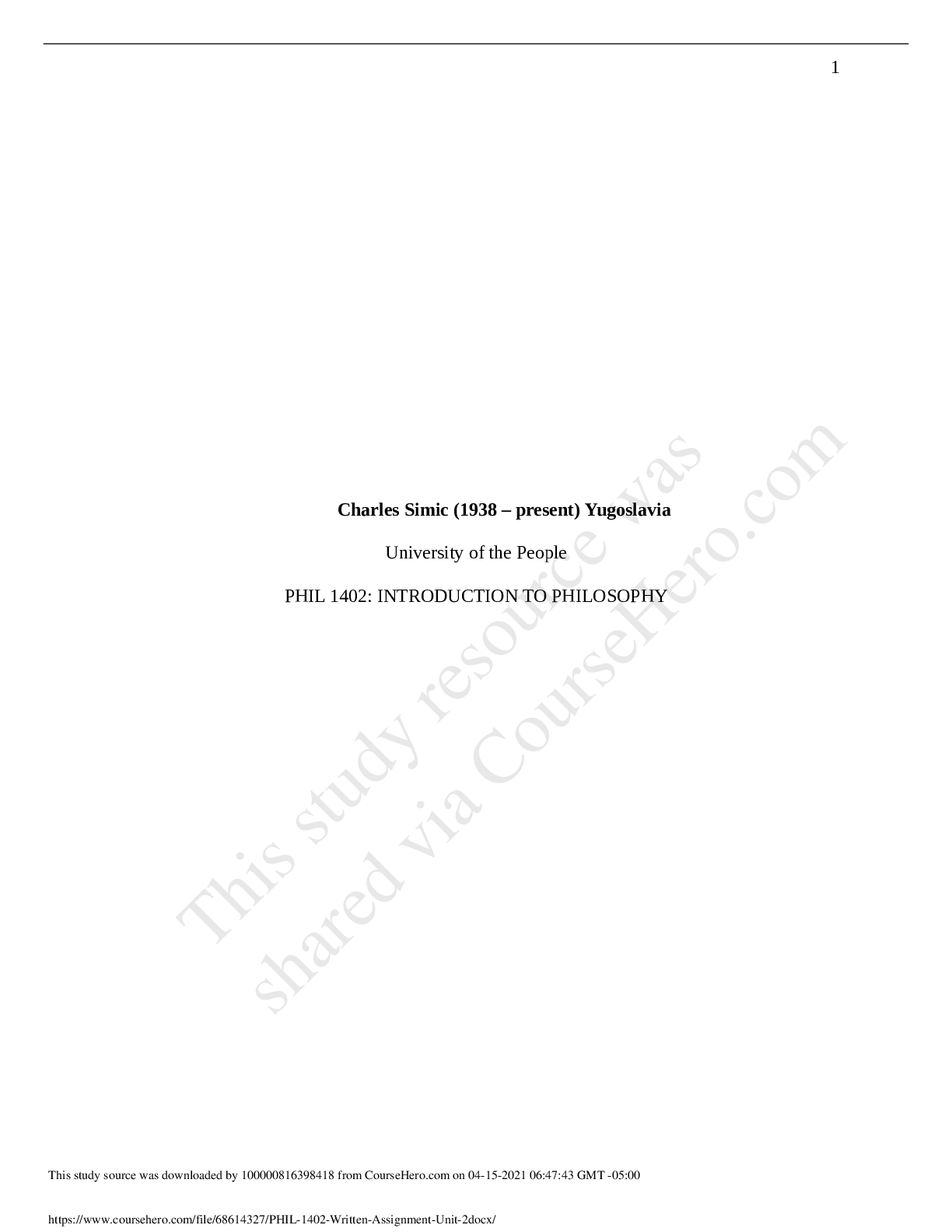 Philosophy > ESSAY > Charles Simic (1938 – present) Yugoslavia University of the People - PHIL 1402 Written Assignment Unit 2 (All)
