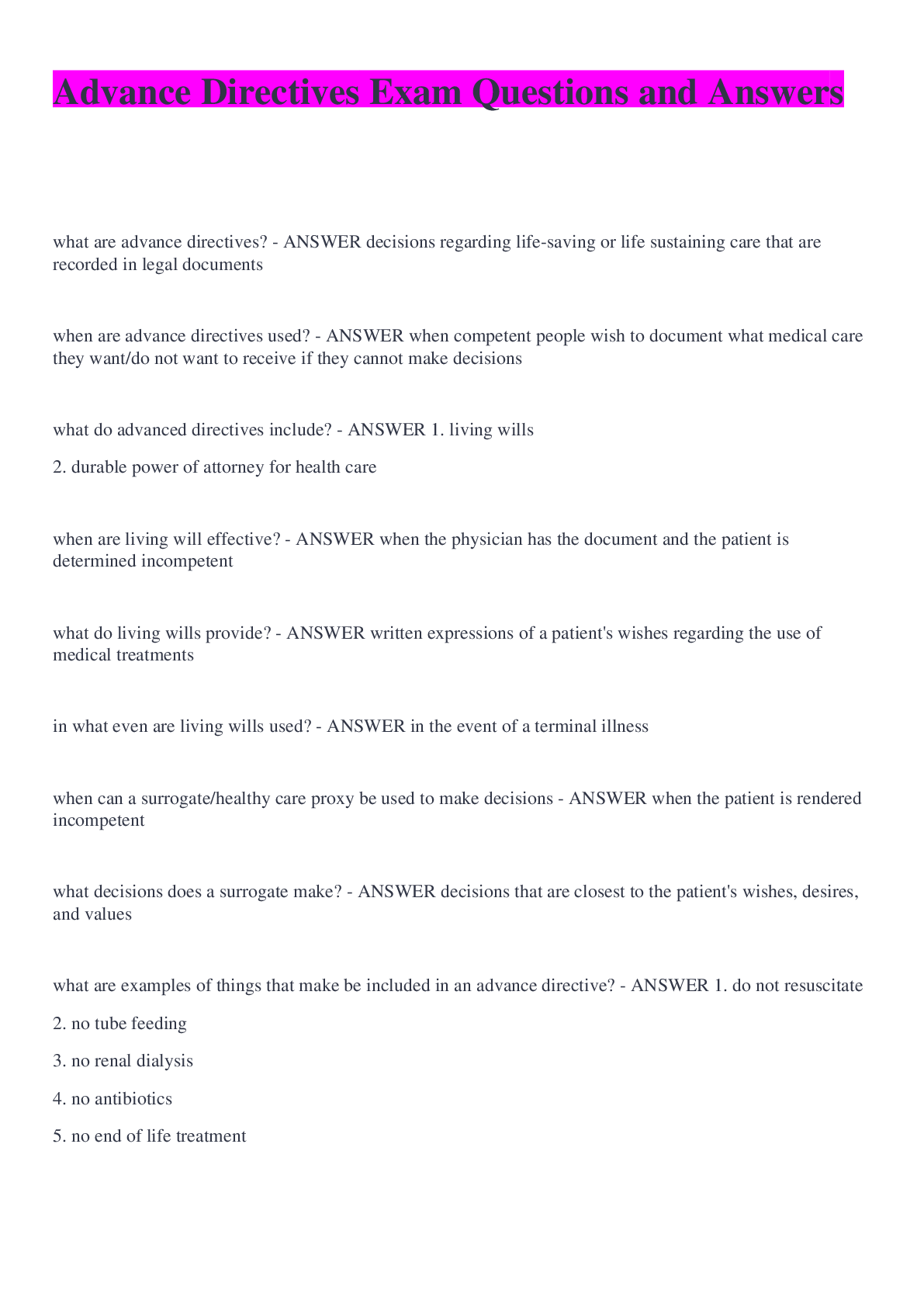 Philosophy > EXAM > Advance Directives Exam Questions and Answers (All)