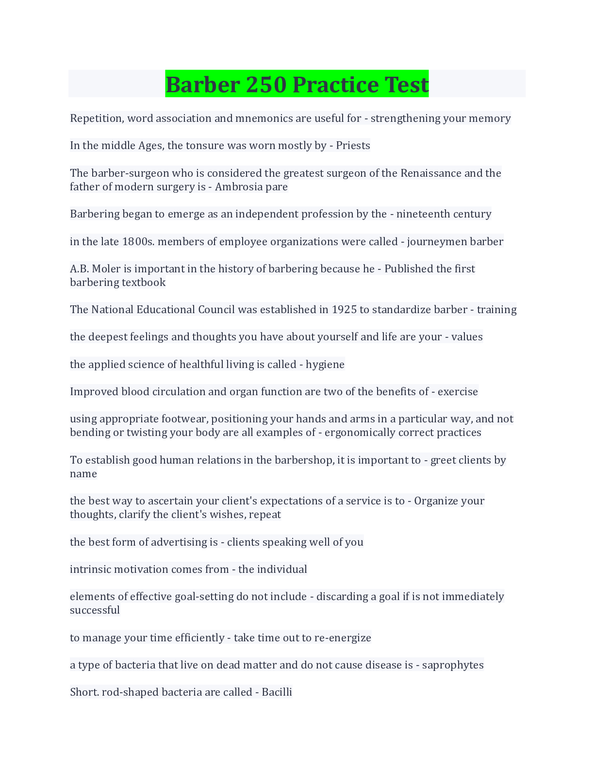 Philosophy > EXAM > Barber 250 Practice Test With Complete Solution/ Download (All)