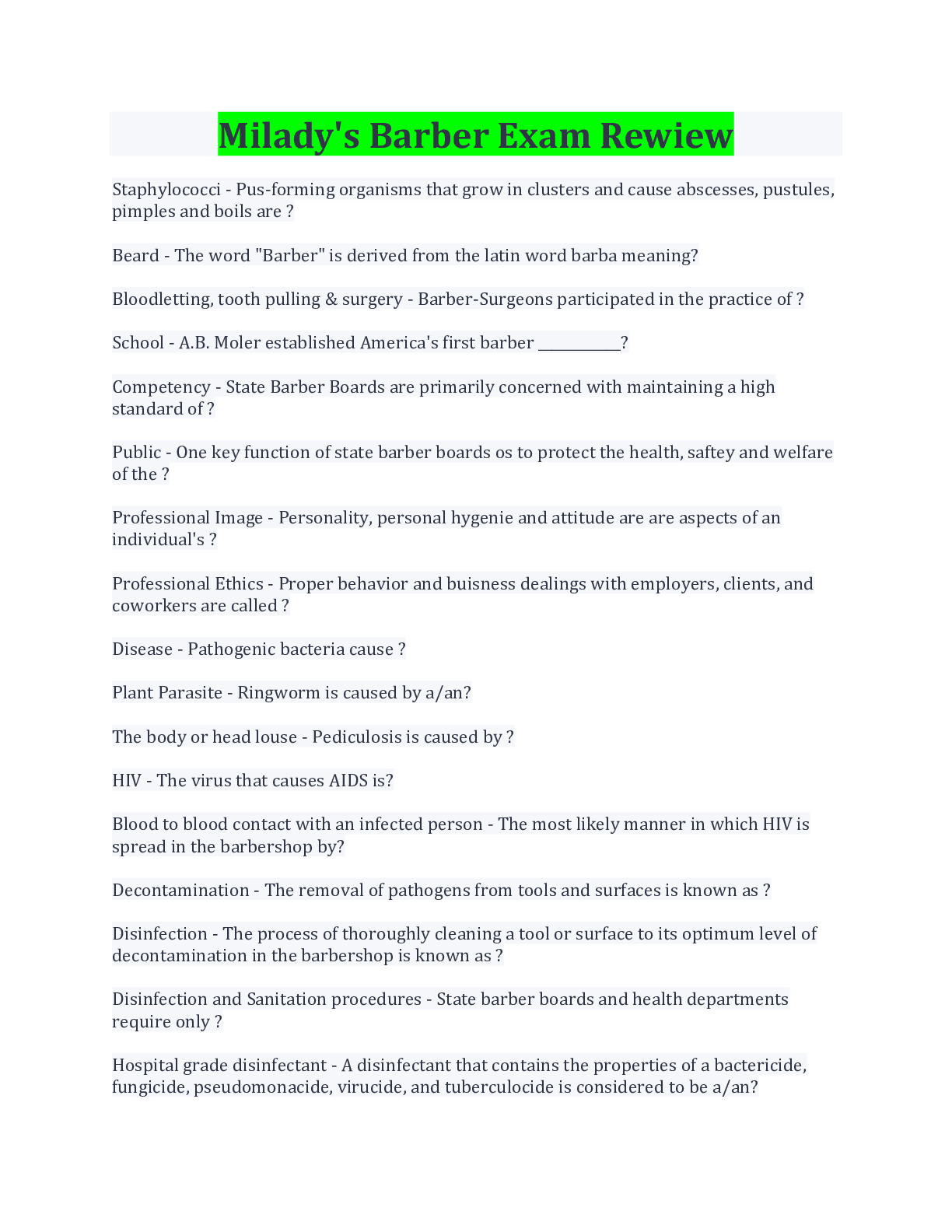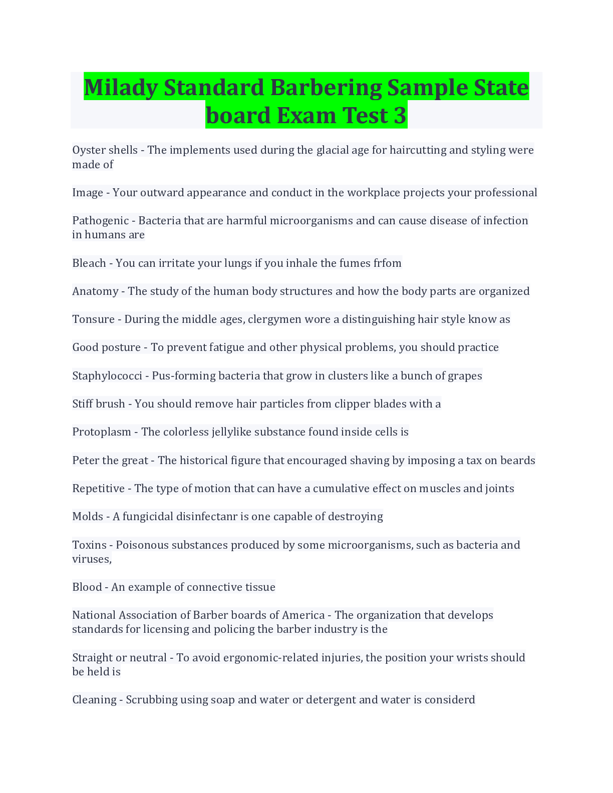 Philosophy > EXAM > Milady's Barber Exam Review Terms And Explanation (All)