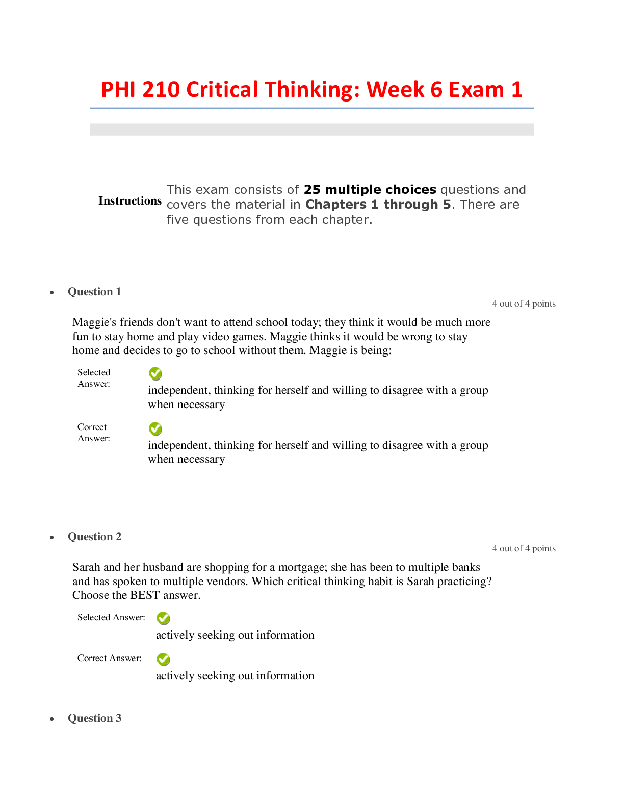 Philosophy > EXAM > PHI 210 Critical Thinking - Strayer University. Week 6 Exam 1. Score 100%. (All)