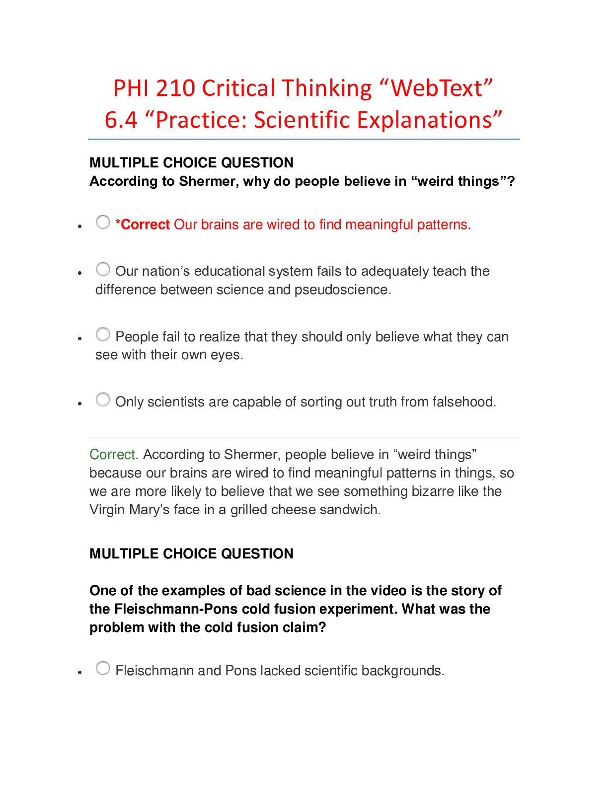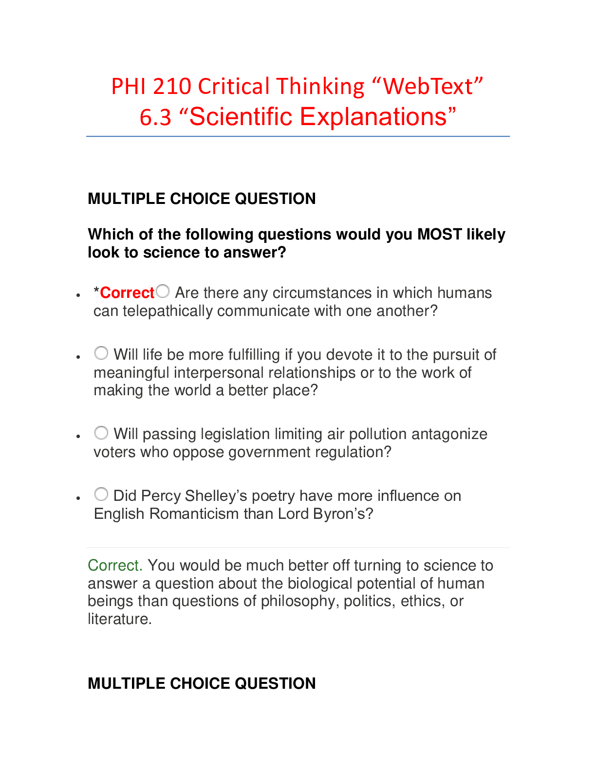 Philosophy > EXAM > PHI 210 Critical Thinking “WebText” 6.4 “Practice: Scientific Explanations”. Latest 2020 Summer. Score 100% (All)