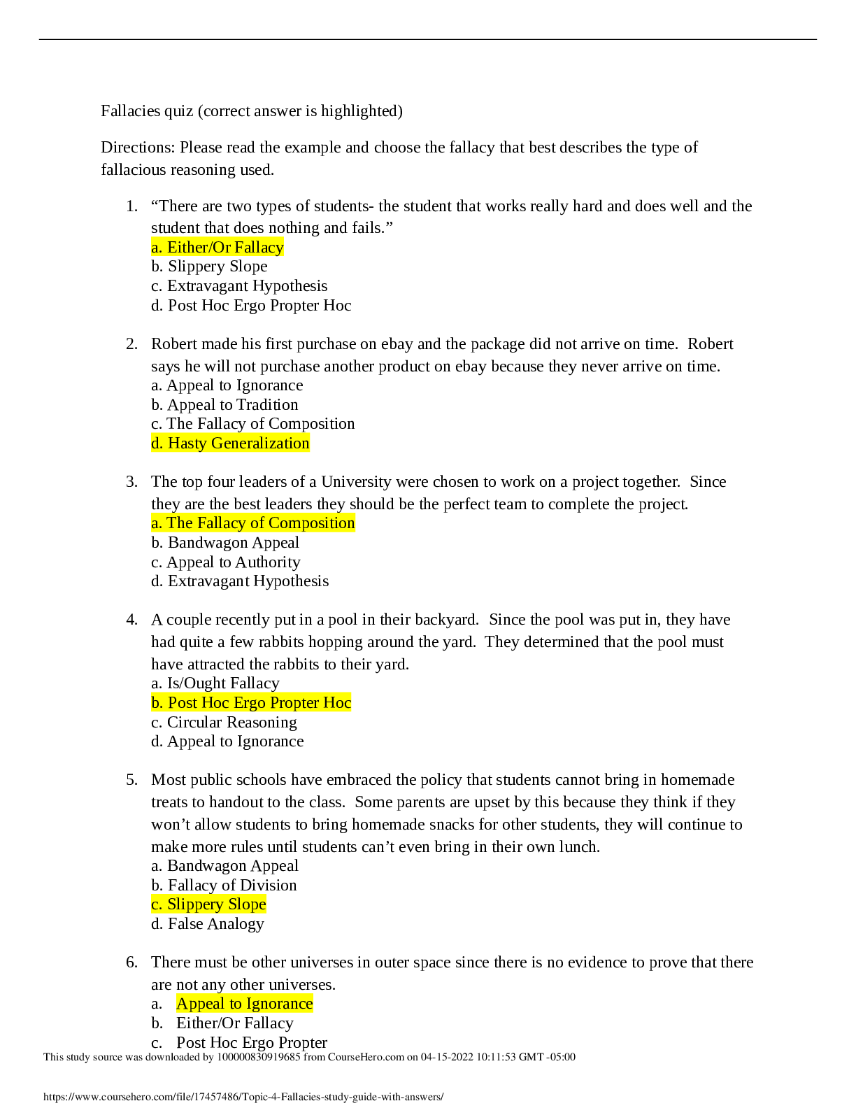 Philosophy > EXAM > Grand Canyon University PHI 105 Topic 4 Fallacies Study Guide With Answers. (All)