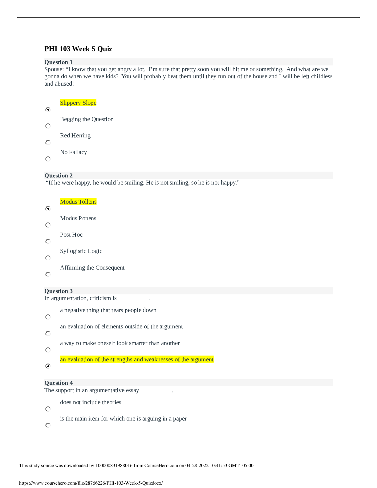Philosophy > QUESTIONS & ANSWERS > PHI_103 Week 4 Quiz -Questions with Answers (All)