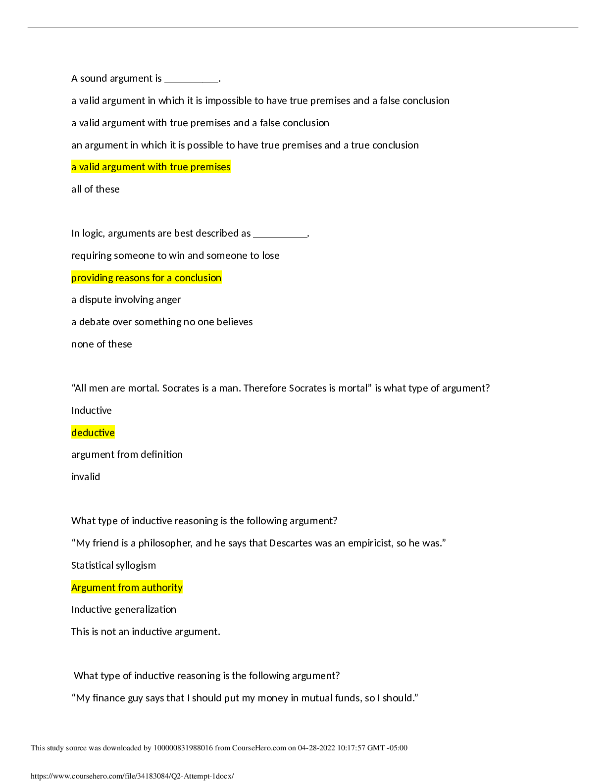 Philosophy > QUESTIONS & ANSWERS > PHI_103 Week 2 Quiz 1-Questions with Answers (All)
