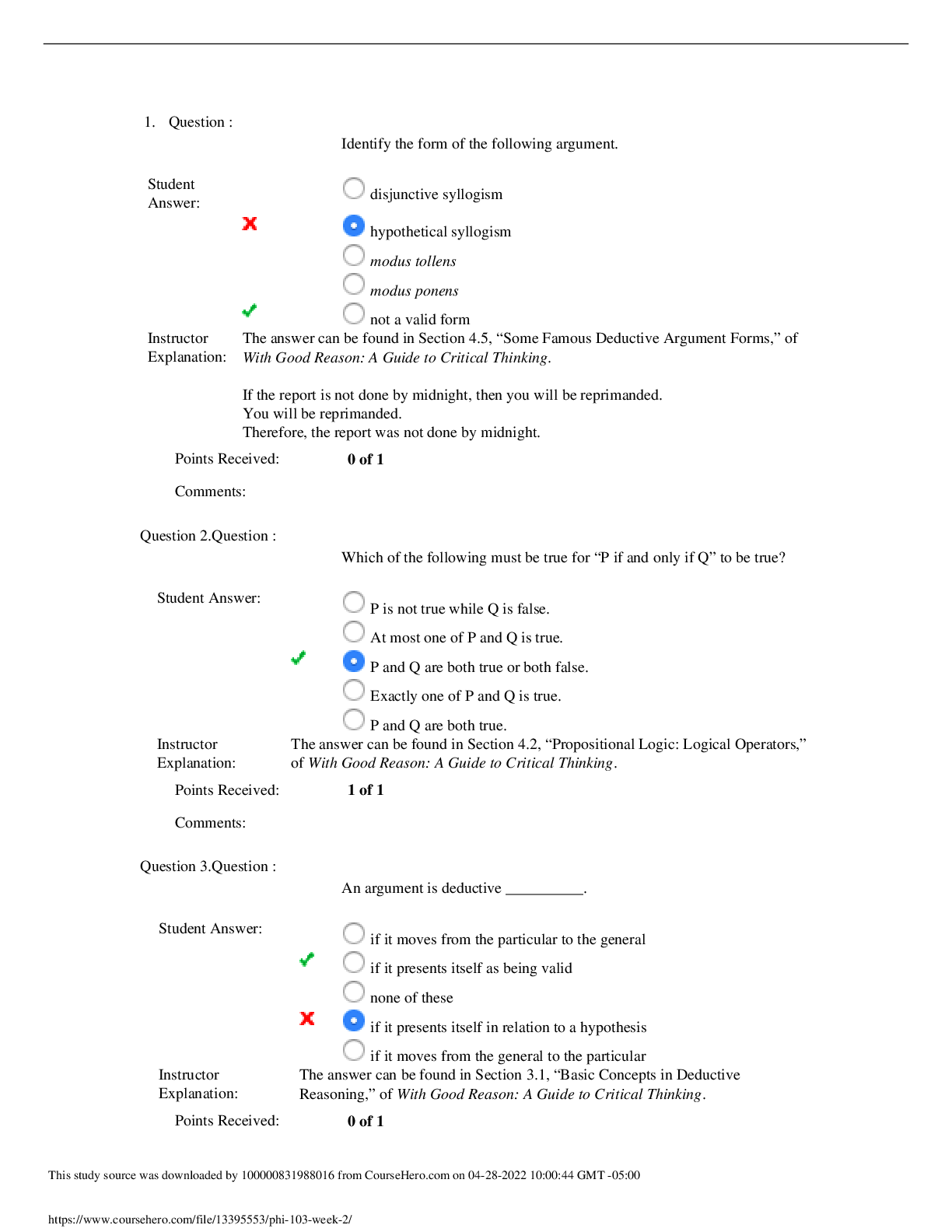 Philosophy > QUESTIONS & ANSWERS > PHI_103 Week 3 Quiz -Questions with Answers (All)