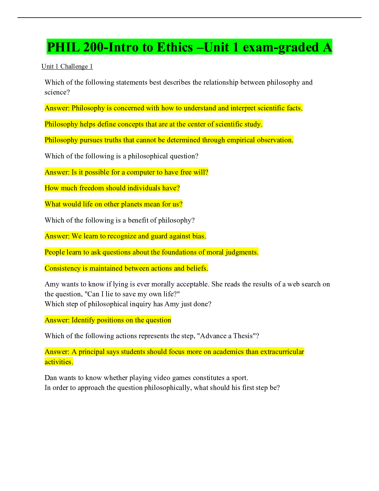 Philosophy > EXAM > PHIL 200-Intro to Ethics –Unit 1 exam-graded A (All)